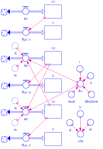 Le modèle permet de simuler le mouvement de particules chargées animées d’une vitesse verticale dans un champ magnétique horizontal et d’observer la projection de leur trajectoire dans le plan yz.