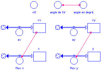 Les éléments v0 et angle de tir permettent de définir les valeurs initiales de vx et de vy.