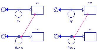 Un modèle permettant d’obtenir une trajectoire plane comporte deux « squelettes » semblables, chacun faisant intervenir les composantes des vecteurs accélération, vitesse et position selon un axe.