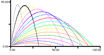 Trajectoires pour différents angles de tir : trajectoires pour une vitesse initiale de 30 m/s et pour un angle de tir en degré variant de 15° à 85° par pas de 5°. Méthode d’Euler, dt = 0.05 s.